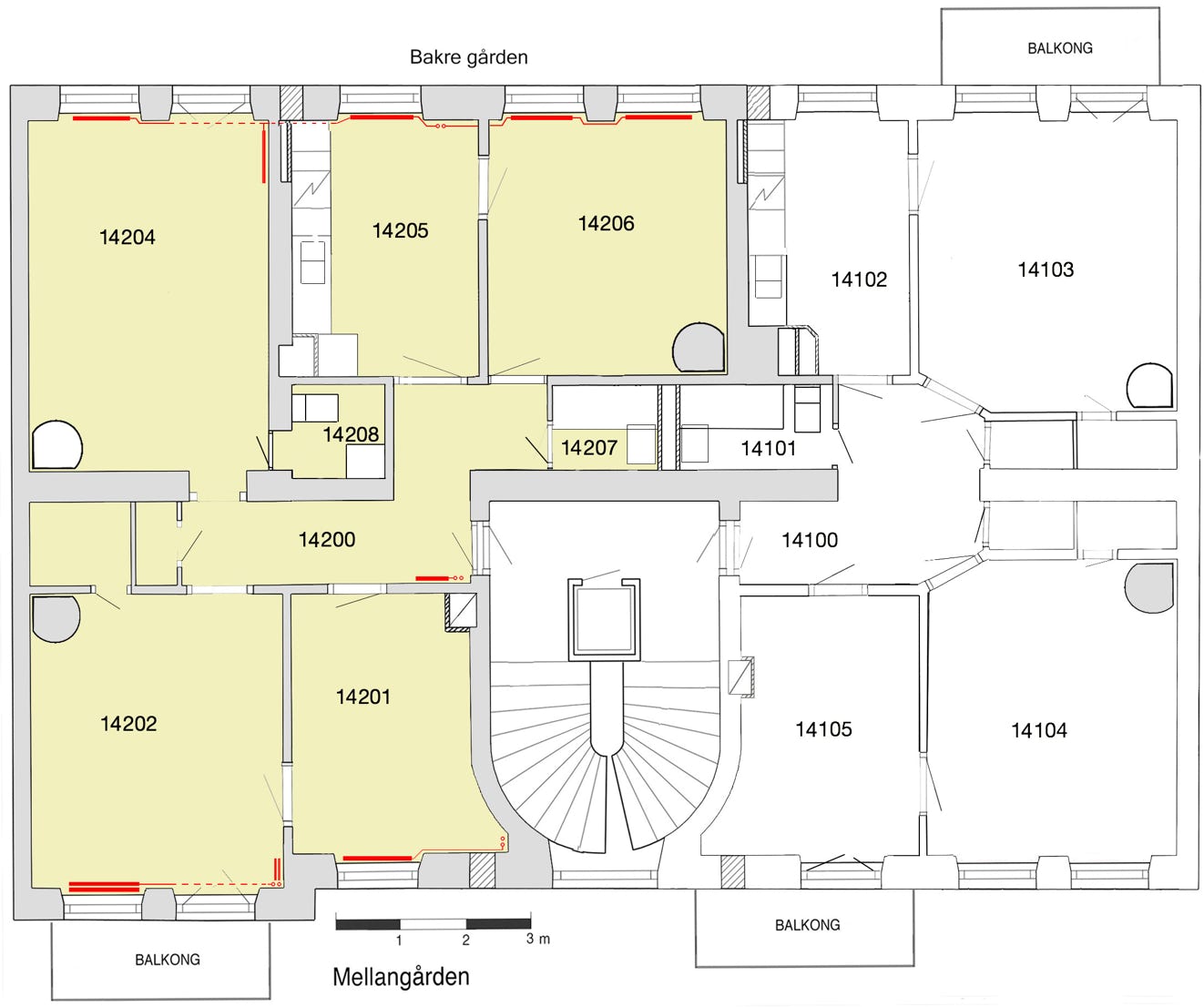 Gårdshuset (B) 4 tr, på vänster sida när man kliver av hissen